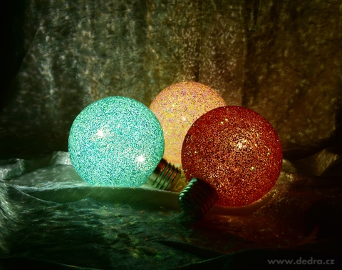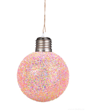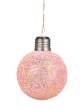 LED světelná koule v jemném meruňkovém tónu s barevnými flitry. Elegantní dekorace na Vánoce i po celý rok. Průměr 8 cm, napájení na 3× LR1130 baterie, spínač ON/OFF.