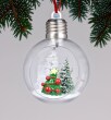 Transparentní LED koule s vánoční scénou uvnitř – stromeček a zasněžené jehličnany. Barevně svítící dekorace o průměru 8 cm rozzáří interiér i sváteční atmosféru.