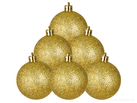 Sada 6 zlatých vánočních koulí ZLATÁ AURA o průměru 6 cm s jemným třpytivým povrchem. Lehoučké, nerozbitné ozdoby dodají stromku i aranžmá slavnostní lesk, eleganci a kouzelnou sváteční atmosféru.
