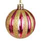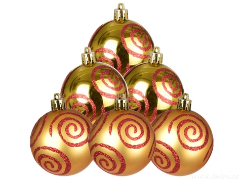 Sada 6 zlatých koulí s červenými spirálami o průměru 6 cm. Hravý i elegantní design rozzáří váš stromeček i sváteční aranžmá. Nerozbitný plast, lesklý a matný mix.