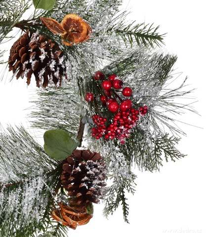 Luxusní vánoční věnec ZASNĚŽENÉ BOBULE o průměru 40 cm s jehličím, bobulemi, šiškami a sušenými pomeranči. Bohatá dekorace na dveře, stůl či krb s jemným zasněženým efektem.