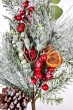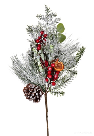 Vánoční větvička ČERVENÝ HLOH s jehličím, bobulemi, šiškou a sušeným pomerančem. Délka 65 cm, s jemným třpytem. Skvělá do vázy, věnce i zimních aranžmá.
