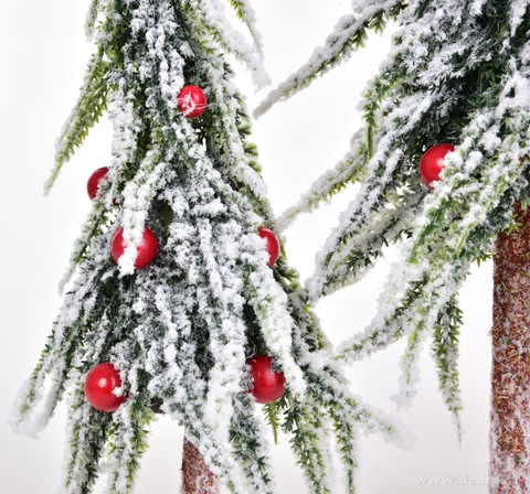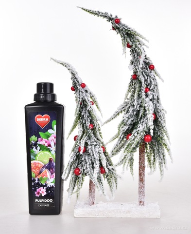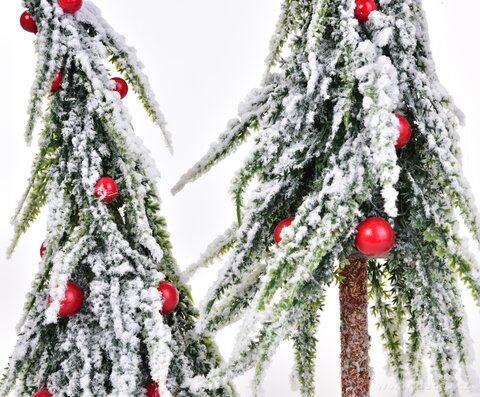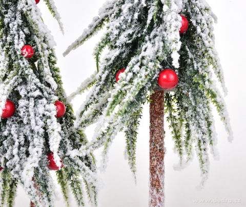 Dva roztomile zkroucené zasněžené stromky s červenými ozdobami působí, jako by vyrostly přímo na mýtince skřítků a víl. Dekorace stojí na pevném podstavci, takže je stabilní a skvěle se vyjímá na komodě, parapetu, slavnostním stole i pod vánočním stromkem.