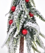 Rozverná zimní dekorace dvou zasněžených stromků s červenými ozdobami na společném podstavci. Výška 40 cm, ideální na komodu, parapet, stůl i pod vánoční stromek.