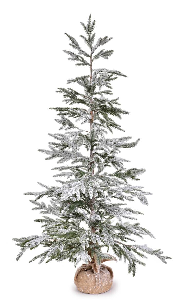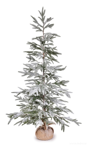 Velký zasněžený smrk LESNÍ TICHO vysoký 160 cm s jutovým podstavcem. Realistické větve s jemným sněhem dodají interiéru klid, noblesu a zimní romantiku v severském stylu.