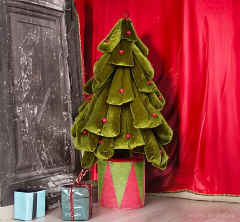 Originální velurový vánoční stromek SAMETOVÝ KLAUNÍK s červenými kouličkami a ohýbatelnými větvičkami. Výška 50 cm. Hravý harlekýnský podstavec dodá dekoraci šmrnc a eleganci.