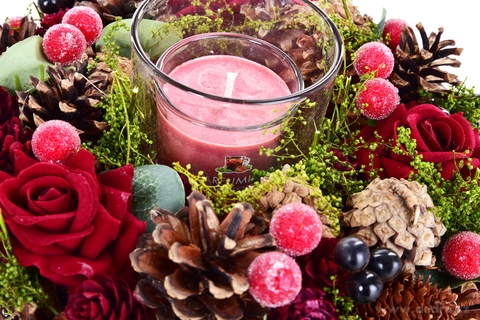 Přírodní vánoční věnec ČERVENÁ HARMONIE s rudými růžemi, bobulemi a šiškami. Uprostřed skleněný svícen na čajovou či válcovou svíčku. Průměr 22 cm, výška 9 cm.