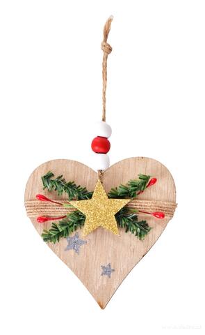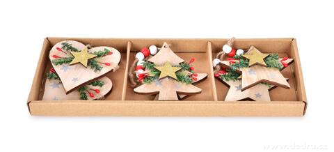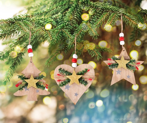 Sada 6 hnědých dřevěných ozdob VÁNOČNÍ KLID s přizdobením. Hvězdičky, stromečky a srdce s jutovou šňůrkou a korálky. Výška 9 cm, délka se šňůrkou 15 cm. Dodáváno v kartonové krabičce.
