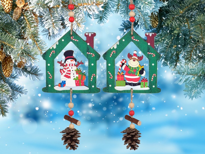 Veselá závěsná dekorace ve tvaru zeleného domečku s vánočním sobem. Celková délka se šňůrkou a přívěskem cca 30 cm, bez šňůrky 21 cm. Dekoraci zdobí barevné dřevěné korálky a pravá šiška, která působí jako přírodní přívěsek.