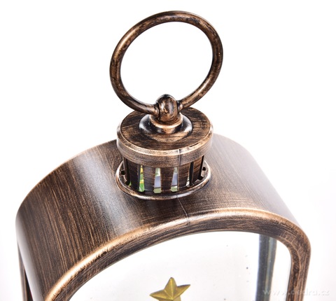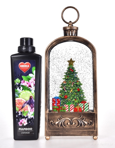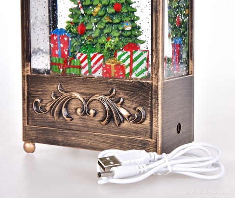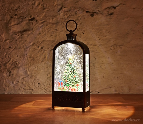 LED lucerna VÁNOČNÍ ZÁŘ se sněžením, vánočním stromečkem a dárky. Svítí teplým světlem, hraje 8 koled a vytváří kouzelnou atmosféru. Výška 33 cm.