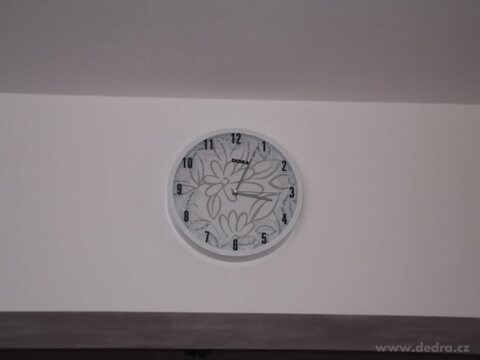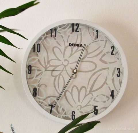 Nástěnné hodiny bílé s květy, kovový lakovaný rám, působí prostorově, protože část motivu je na ciferníku a druhá část je natištěna saténovým potiskem na krycím skle, originální dvoubarevné ručičky, quartzový strojek na 1 tužkovou baterii (není součástí).