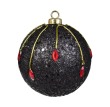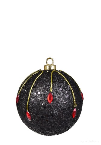 Luxusní vánoční koule ONYX & RUBÍN s černým povrchem, zlatými provázky a rudými krystaly. Výjimečná ozdoba o průměru 9 cm, která dodá stromku i interiéru dramatický efekt, slavnostní eleganci a jiskru vánoční magie.