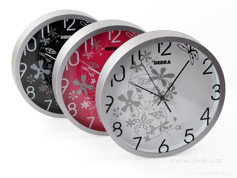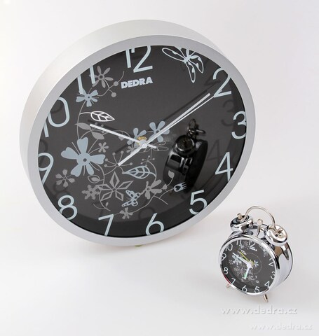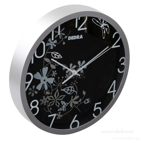 Nástěnné hodiny černé s ornamenty, působí prostorově, protože část motivu je na ciferníku a druhá část je natištěna saténovým potiskem na krycím skle, rám hliníkového vzhledu, quartzový strojek na 1 tužkovou baterii (není součástí).