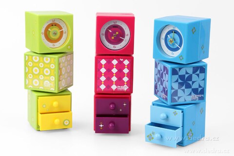 Budík se 4 rámečky na fotografii a 2 zásuvkami na drobnosti, je tvořený 3 spojenými kostkami, které lze různě otáčet, quartzový strojek na 1 tužkovou baterii (není součástí). Materiál: plast, výška: 23 cm.