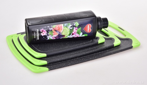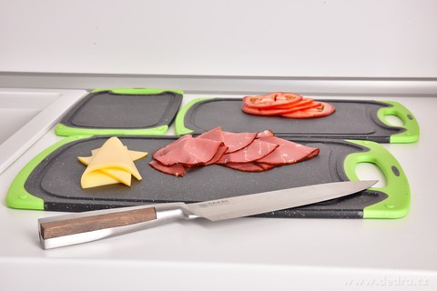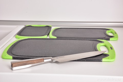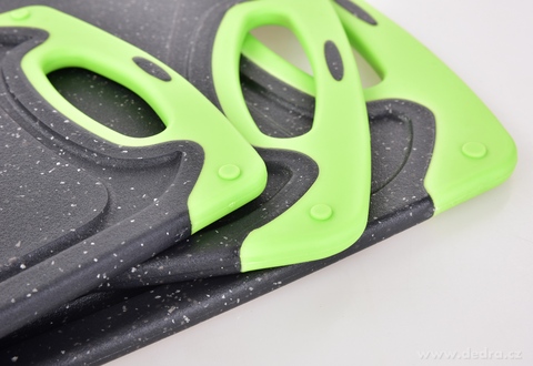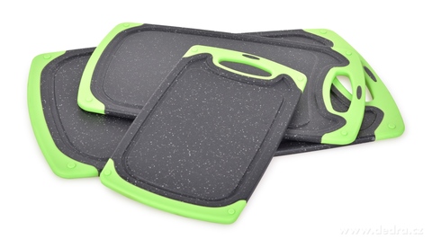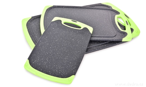 Praktická sada tří oboustranných prkének GOURMET v zeleno-černém provedení s protiskluzovými okraji pro bezpečné krájení. Hygienický plast, snadná údržba, úsporné skladování a 3 velikosti pro každou kuchyň.