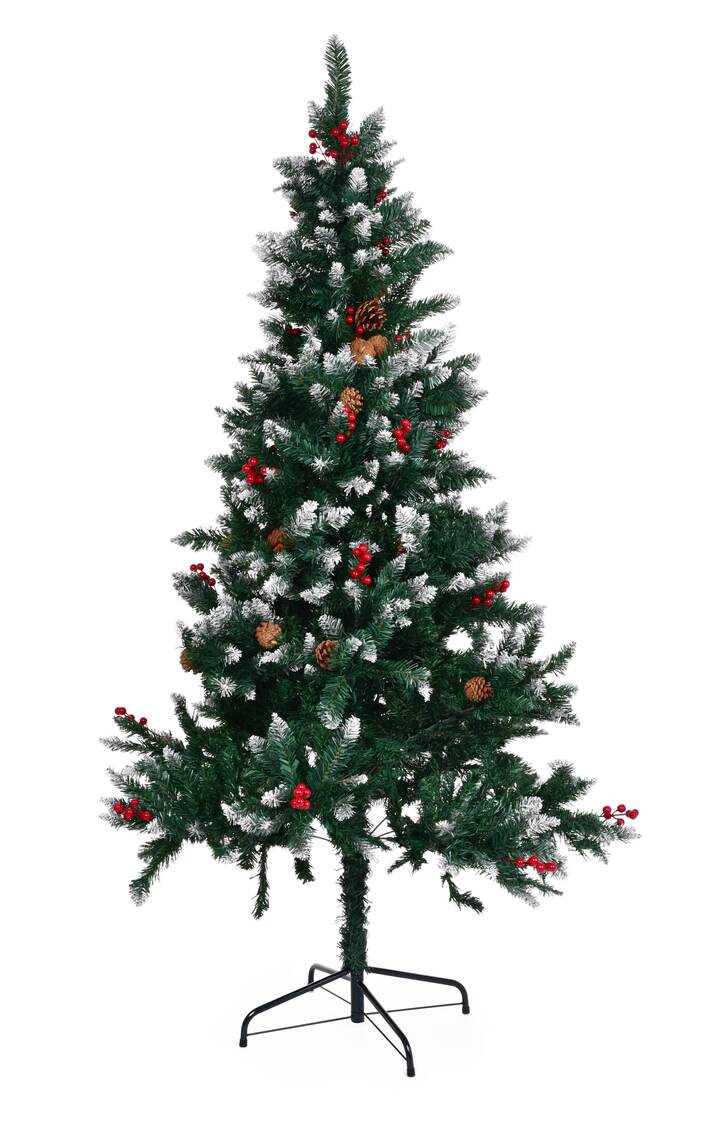 Zasněžený smrk s přírodními šiškami a červenými bobulemi hlohu, vysoký 150 cm. Umělý vánoční stromek se sněhovým efektem, ohebnými větvičkami a stabilním kovovým stojanem. Realistický vzhled, dlouhá životnost.