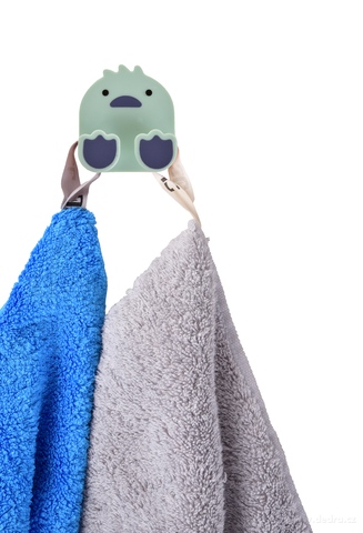 Praktický věšák KÁČÁTKO v jemné mátové barvě. Umožňuje zavěsit ručníky a utěrky i bez poutka. Instalace bez vrtání díky samolepicí podložce. Hravý a stylový doplněk do koupelny, kuchyně i dětského pokoje.