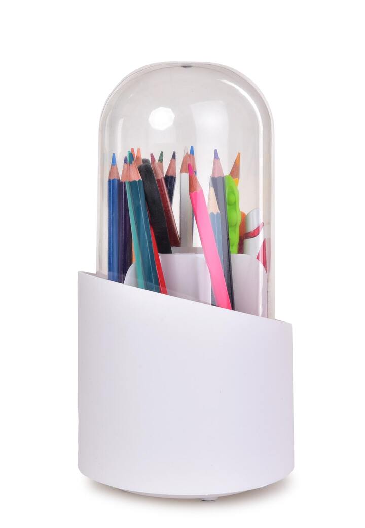 Elegantní otočný organizér BEAUTY s průhledným víkem a 7 přihrádkami. Průměr 12 cm, výška 23,5 cm. Ideální na kosmetiku, štětce, šperky i kancelářské potřeby. Otočný mechanismus 360° a protiskluzové podložky pro snadné použití.