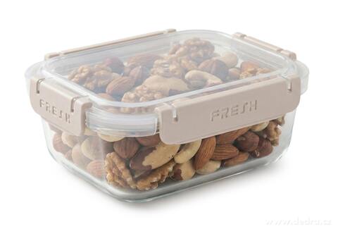 Skleněná dóza na potraviny FRESH GLASS s víkem se silikonovým těsněním a čtyřmi pevnými klipsy zajistí hermetické uzavření, díky kterému zůstane obsah chráněn před vzduchem a vlhkostí. Potraviny tak vydrží déle čerstvé a chutné.