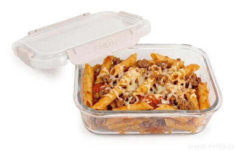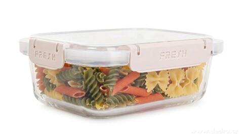 Skleněná dóza na potraviny FRESH GLASS, víko se silikonovým těsněním 4 klipsy pro pevné uzavření. Kvalitní provedení ze skla a pevného plastu.