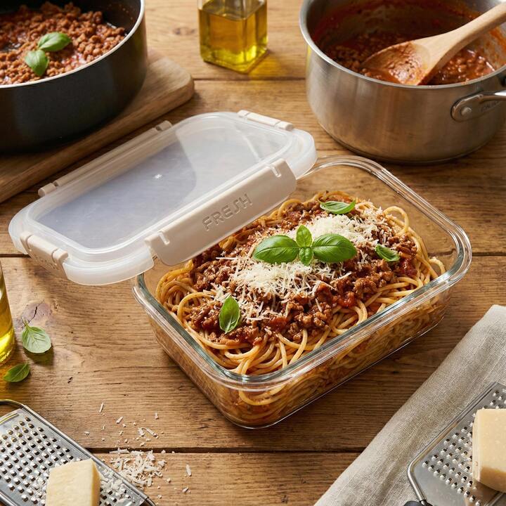 Skleněná dóza na potraviny FRESH GLASS s víkem se silikonovým těsněním a čtyřmi pevnými klipsy zajistí hermetické uzavření, díky kterému zůstane obsah chráněn před vzduchem a vlhkostí. Potraviny tak vydrží déle čerstvé a chutné.