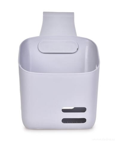 Praktický organizér PRAKTIK s háčkem na zavěšení v šedé barvě. Rozměr 15,5 × 13 × 10,5–17 cm, odolný plast s větracími otvory. Modulární systém – možnost spojovat více kusů. Vhodný do koupelny, kuchyně i šatny.