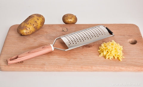 Ruční jemné struhadlo CHEF je nepostradatelným pomocníkem pro každého, kdo si potrpí na precizní přípravu ingrediencí. Jemné ostří z nerezové oceli perfektně zvládne strouhání parmezánu, čokolády, tvrdého pečiva a dalších surovin, u kterých chcete dosáhnout jemné struktury. Kombinace lesklé nerezové oceli a pohodlné rukojeti s imitací dřeva zajišťuje atraktivní vzhled a komfort při práci. Protiskluzová podpora brání nechtěnému pohybu po pracovní ploše a zvyšuje bezpečnost při strouhání.