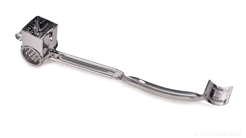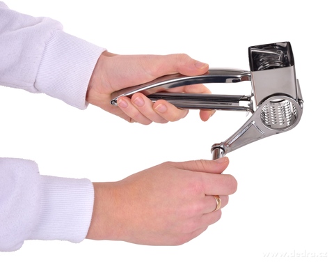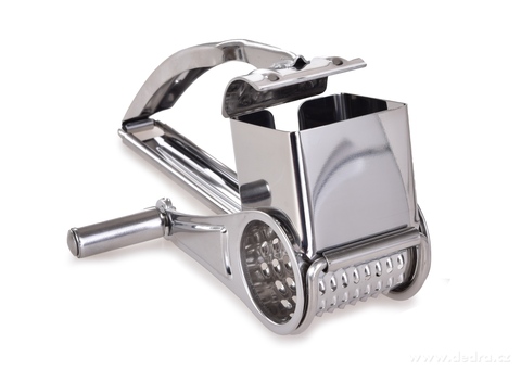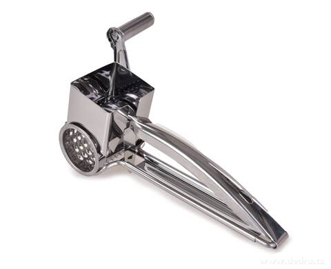 Nerezové ruční rotační struhadlo GOURMET s klikou pro snadné strouhání čokolády, parmezánu, oříšků, ovoce i zeleniny. Bezpečné použití díky tlačítku, odolná konstrukce a univerzální využití v kuchyni.