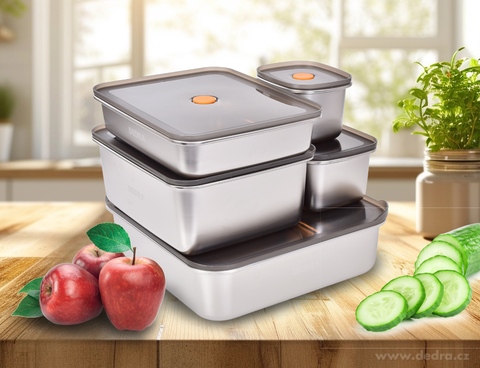 Prémiová nerezová dóza GOURMET (450 ml) s průhledným víkem, silikonovým těsněním a ventilem udržuje potraviny déle čerstvé a chrání je před vysypáním i vlhkostí. Ideální na svačiny, obědy do práce, cesty i zdravé krabičkování – elegantní, trvanlivá, hermetická.