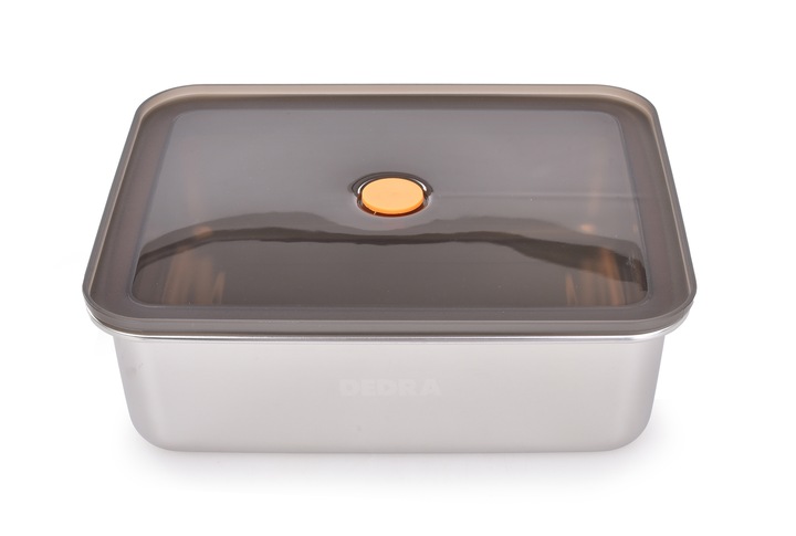 Nerezová dóza GOURMET 2,3 L s průhledným víkem, silikonovým těsněním a ventilem bezpečně těsní, chrání jídlo před vysypáním, vzduchem i vlhkostí. Stylové a trvanlivé řešení pro obědy do práce, krabičkové diety, výlety i domácí skladování potravin.