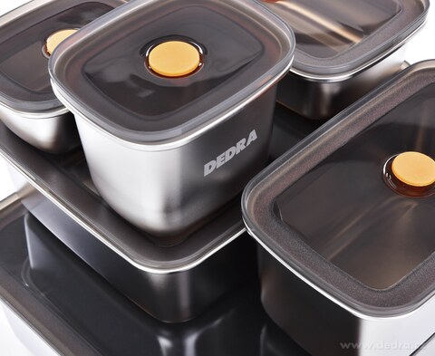 Nerezová dóza GOURMET (2,3 L) s průhledným víkem a silikonovým těsněním + ventilem uchová potraviny čerstvé, šťavnaté a bezpečně uložené, aniž by došlo k vysypání nebo protékání. Elegantní kartáčovaná nerezová ocel je odolná, hygienická a nezachycuje pachy – ideální pro obědy do práce, krabičkové diety, cestování, pikniky i dlouhodobé skladování potravin doma.