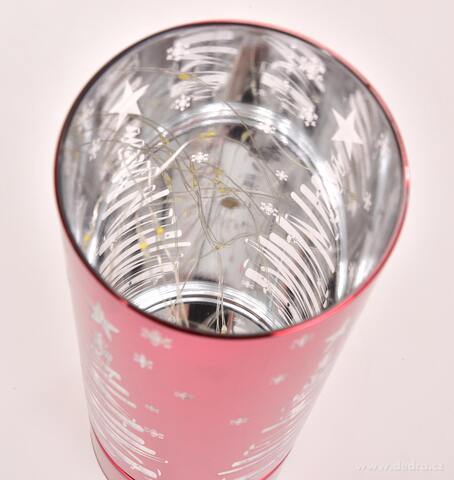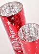LED skleněný svícen SVĚTÝLKA ZIMNÍHO STROMKU v červeném provedení se zrcadlovým efektem a motivem stromku, vloček a hvězdiček. Výška 25 cm, teplé světlo LED navodí kouzelnou vánoční atmosféru a slavnostní pohodu.