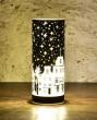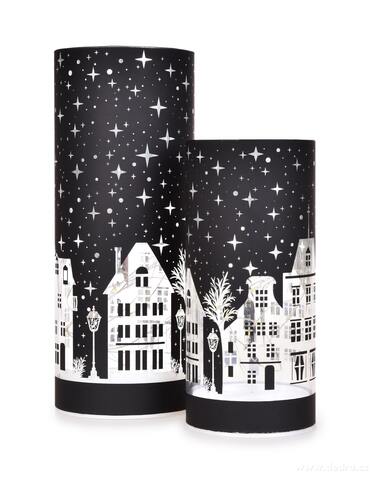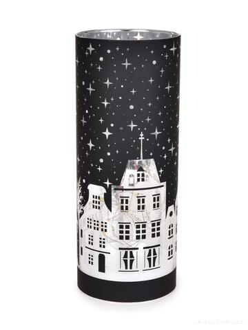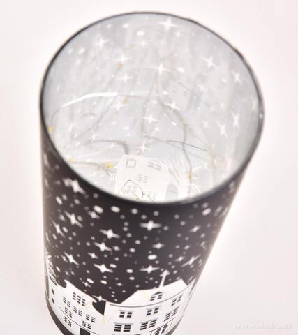 Elegantní LED svícen NOČNÍ MĚSTEČKO z černého skla s motivem zimního města a hvězdné oblohy. Vnitřní zrcadlový efekt krásně rozptyluje teplé bílé světlo. Výška 20 cm, průměr 8 cm.