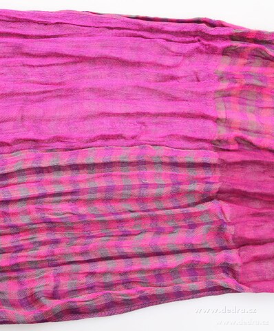 Šál mačkaný ve fuchsiových tónech s třásněmi.