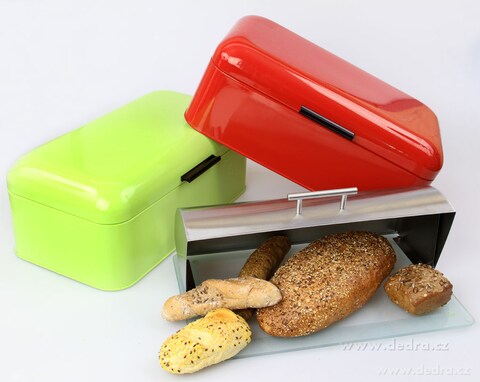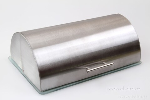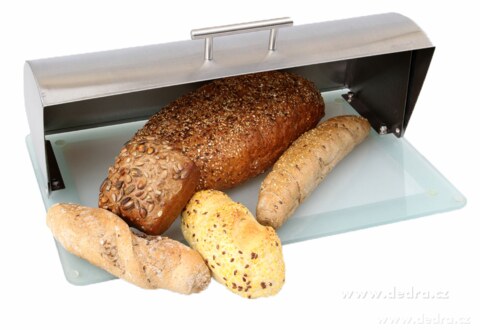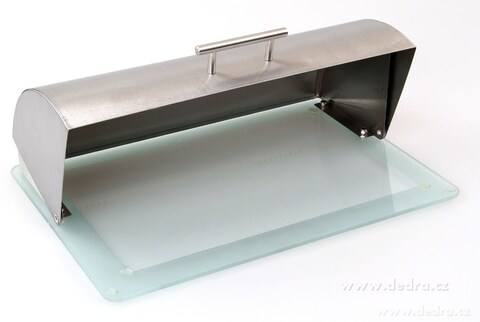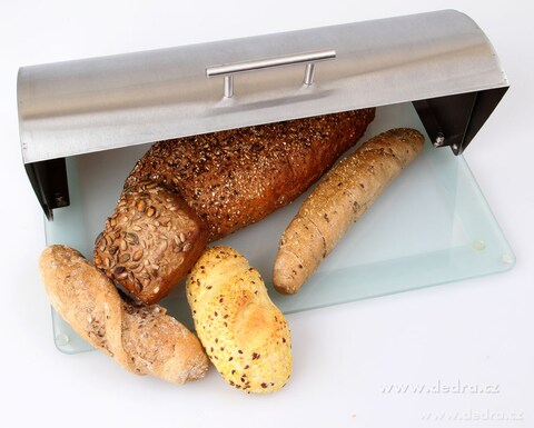 Velký nerezový chlebník se základnou z tvrzeného skla s pískovaným okrajem. Na spodní části 4 protiskluzové silikonové body. Na zadní straně jsou speciální otvory zajišťující přirozenou cirkulaci vzduchu a to, že se potraviny ani pečivo nezapaří.