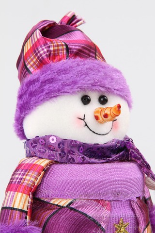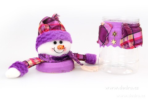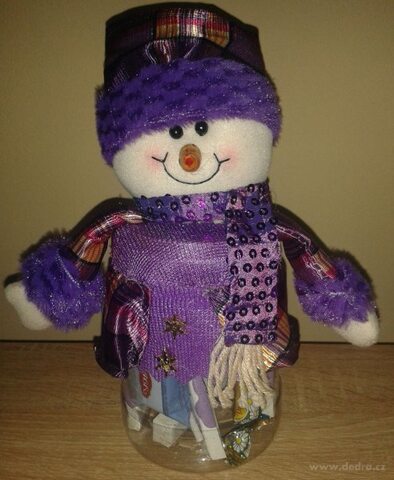 Průhledná dóza s textilním sněhulákem Huhulákem na mikulášskou koledu, rozměr pevné plastové dózy: průměr: 10 cm, výška: 14 cm, celková výška: 29 cm.