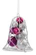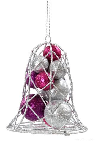 Ozdoby tvořené stříbrnou kovovou konstrukcí vyplněnou třpytivými kouličkami různých velikostí ladící do fuchsiovo-stříbrno-fialovýchtónů. Délka: 10,5 cm.