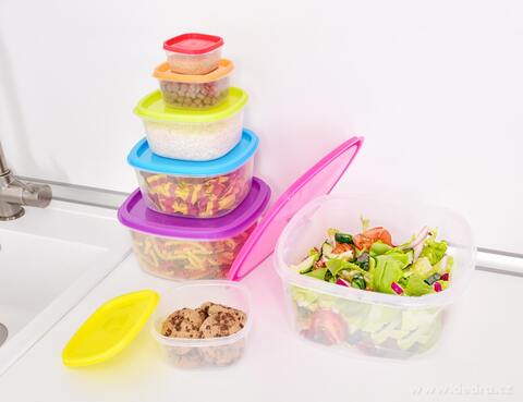 Praktická sada 7 plastových dóz s barevnými víky na uchovávání, přenášení a mražení potravin. Úsporně se skládají jedna do druhé, vhodné do myčky, mikrovlnky i mrazničky – ideální pro krabičkové diety a domácí skladování.