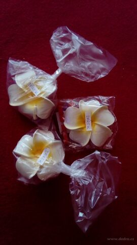 3 ks dekorativní květ plumeria alba, průměr cca 9 cm. Ve spodní části kovová spona na přichycení. Těmito dekorativními ateliérovými květinami můžete ozdobit např. svíčky, dekorace ze suchých plodů nebo dekorativních kamenů, závěsy, jídelní tabuli –na ubrousky, servítky, prostírání… Vytvoří dokonalý pocit ZENové rovnováhy – výzdoba masérských a kosm...