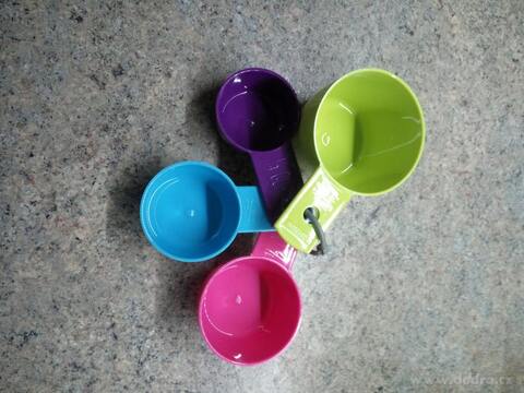 Při skladování šetří místo – krásně do sebe zapadají. Objemy: 1 hrnek = 250 ml, 1/2 hrnku = 125 ml, 1/3 hrnku = 80 ml, 1/4 hrnku = 60 ml, materiál: tvrzený plast, mix barev*.