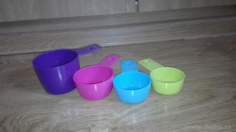 Pro milovníky (nejen) hrnkových receptů. Při skladování šetří místo – krásně do sebe zapadají. Objemy: 1 hrnek = 250 ml, 1/2 hrnku = 125 ml, 1/3 hrnku = 80 ml, 1/4 hrnku = 60 ml, materiál: tvrzený plast, mix barev*. *Barevná skladba každé sady je náhodná. Nemusí se shodovat s fotografi í. Příklad: = 60 ml v jedné sadě je největší odměrka oranžová,...