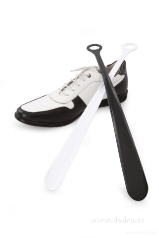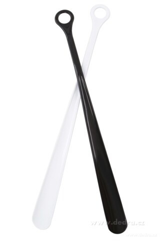 Lžíce na nazouvání obuvi s ouškem na zavěšení. Materiál tvrzený plast, délka: 46,5 cm.