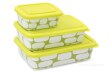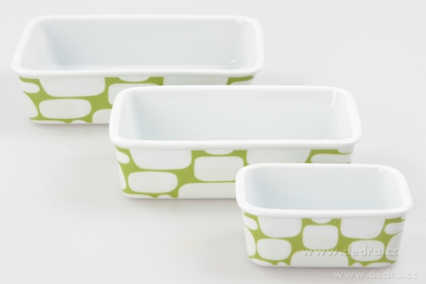 zapékací/ohřívací a ukládací mísy se silikonovým víkem. Praktické při skladování – všechny mísy se vejdou do sebe (nezaberou místo). Rozměry/objemy: 12 x 9 x 4,5 cm/250 ml, 18,5 x 12 x 5 cm/700 ml, 21,5 x 15 x 5,5 cm/1000 ml.