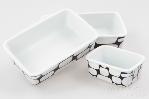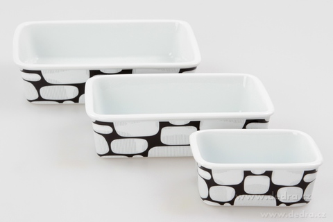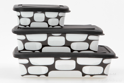 Zapékací/ohřívací a ukládací mísy se silikonovým víkem. Praktické při skladování – všechny mísy se vejdou do sebe (nezaberou místo). Rozměry/objemy: 12 x 9 x 4,5 cm/250 ml, 18,5 x 12 x 5 cm/700 ml, 21,5 x 15 x 5,5 cm/1000 ml.