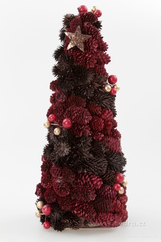 Výška cca 35 cm, dolní průměr cca 15 cm. Dekorace vytvořené ze šišek v kombinaci tmavě vínové a hnědé barvy, vkusně dozdobené lesními plody v červeno-zlaté kombinaci a metalickými hvězdami