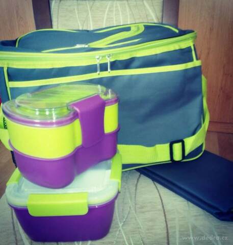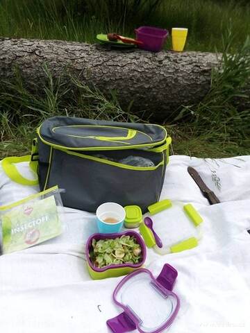v horkém létě. Brašna i podložka jsou vyrobeny z pevné textilie, která je z rubové strany opatřena nepromokavou vrstvou. Vnitřní část brašny je vyložena termoizolační fólií.