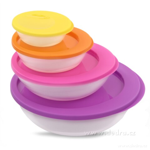 sada 4 dóz na uchovávání, ohřívání, zamrazování a rozmrazování potravin. Z odolného plastu. Dózy jsou vhodné do myčky, mikrovlnky i mrazničky. Objem dóz: 0,2 L/0,54 L/1,2 L/2,0 L, rozměr největší dózy cca 26 x 26 x 13 cm.