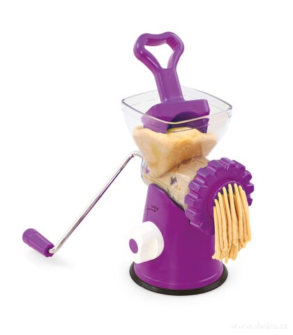 Vyrobeno ze speciálně tvrzených vysoce odolných plastů, krájecí nůž a oba disky (s většími a s menšími otvory pro mletí) jsou z nerezavějící oceli. Rychlé a stabilní uchycení, na téměř každý povrch, díky gumové přísavce, která je po celé spodní části. Doporučujeme tuto přísavku předem navlhčit = tím dojde k velmi silnému přilnutí ke kuchyňským povrchům. Plastové části lze mýt v myčce. Součástí balení je sada 7mi různých nástavců na těstoviny, velká plastová dóza o max. objemu 1,7 litru a nástavec na plnění klobás a párků. Masivní provedení, dodáváme včetně návodu v českém jazyce.