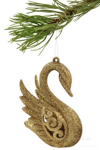 2 ks velkých zlatých třpytivých labutí krajkového vzhledu, výška: 11 cm.