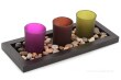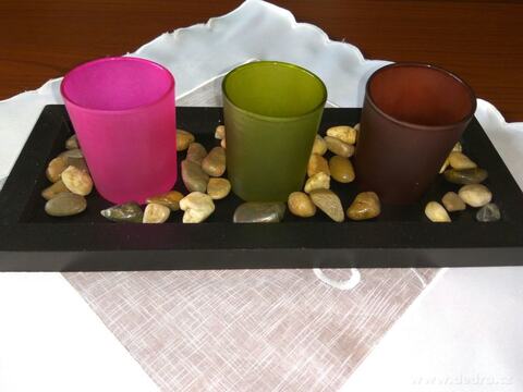 Skleněné svícny na čajové svíčky v tónech fuchsiové, zelené a hnědé. Svícny jsou postaveny na elegantním dřevěném podstavci a ozdobeny dekorativními kameny v přírodních barvách. Svícen doplní váš interiér a vykouzlí útulnou domácí atmosféru. Max. rozměry skleněných svícnů: průměr 5,5 cm, výška 6,5 cm Max. rozměry sestaveného svícnu: 30 x 12,5 x 8 c...
